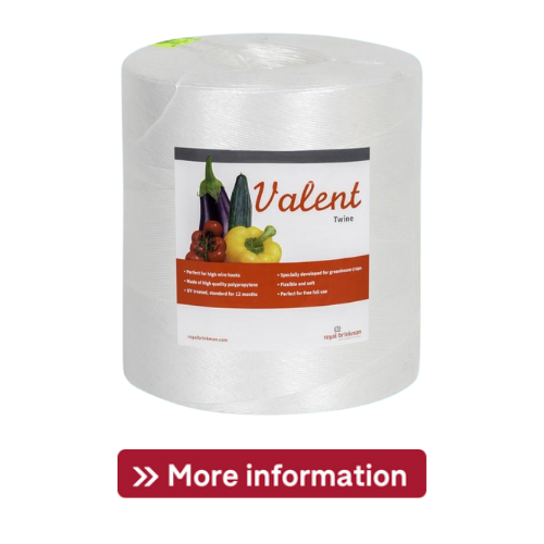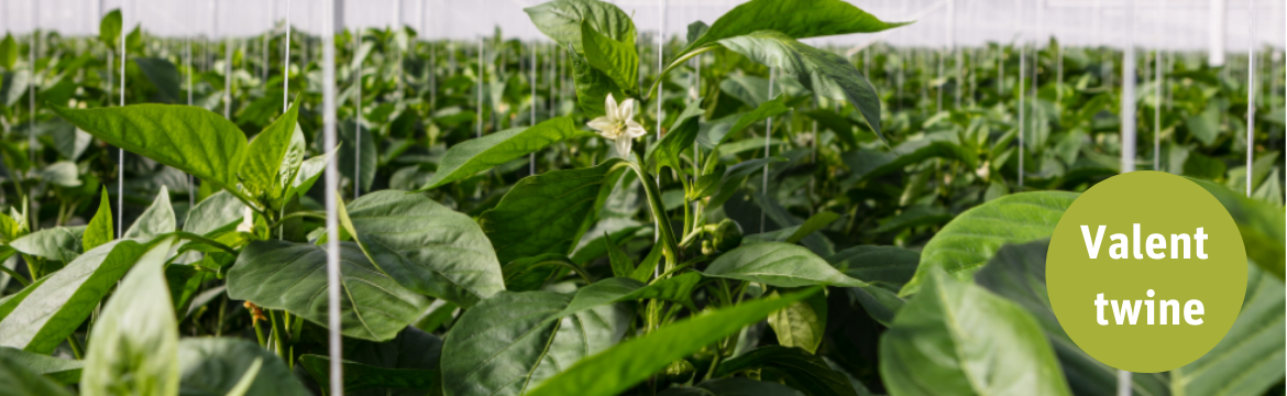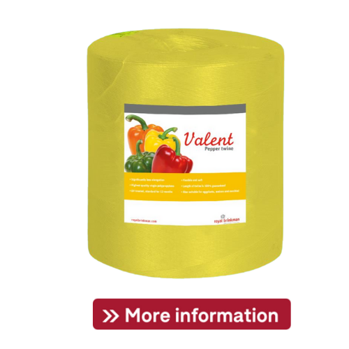 Valent Twine is made for various crops including tomato, cucumber, eggplant and bell pepper crops. Valent Twine distinguishes itself in strength and flexibility and is available in different colors. The twine provides the proper support during the cultivation process and because of the synthetic fibers you are assured of minimal risk of twine breakage.